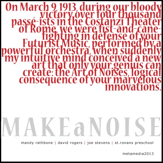 Download a 4 track studio version of the metamedia performance at DIVAcontemporary Studio on 9th April. Celebrating the 100th anniversary of the Futurist manifesto ‘the art of noise’ http://metamedia.bandcamp.com/album/makeanoise